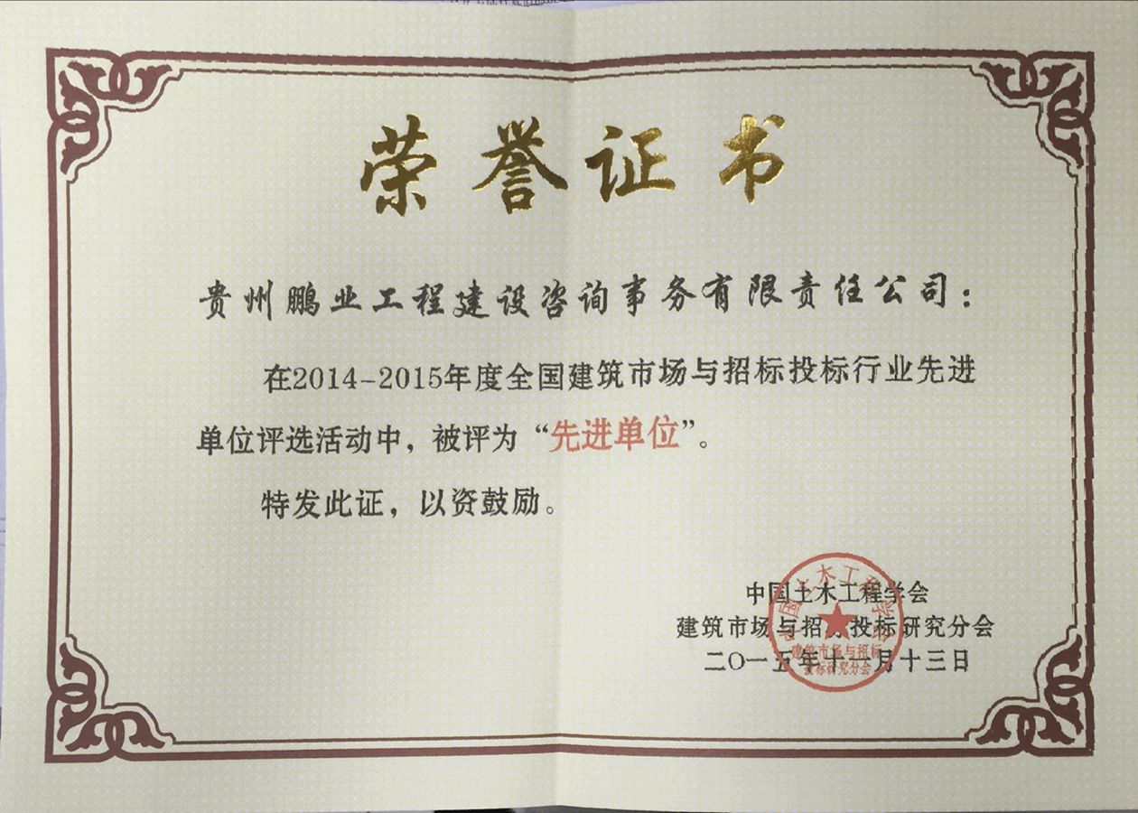 獲得2014-2015年度全國(guó)建筑市場(chǎng)與招標(biāo)投標(biāo)